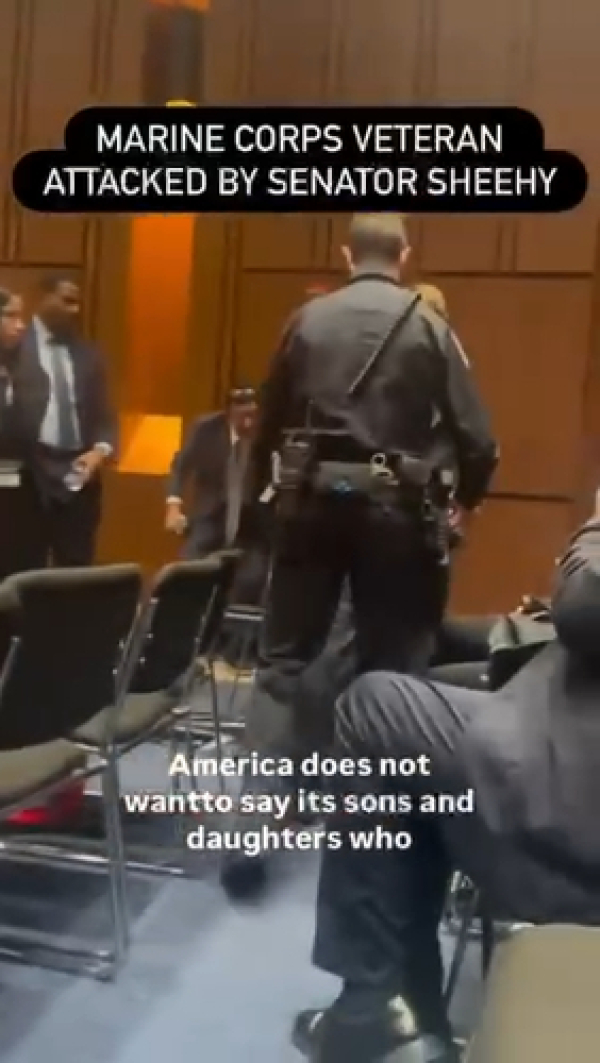 44-летний ветеран морской пехоты Брайан Макгиннис пришёл на слушания в Сенат в форме, чтобы задать один вопрос: почему Америка снова воюет за Израиль? Встал и крикнул: «Америка не хочет посылать своих сыновей и дочерей воевать за Израиль!».