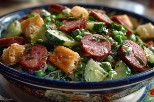 Беру копченую колбасу, свежий огурец, консервированный горошек и сухарики — нарезаю, смешиваю с майонезом, и через минуту на столе салат, который получается сытным, хрустящим и невероятно вкусным. Это гениально простое и невероятно вкусное блюдо, идеальное для быстрого ужина, перекуса или праздничного стола.
