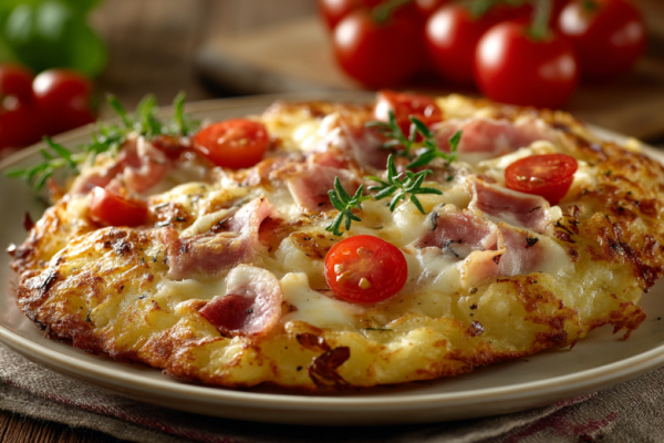 Для приготовления вам понадобится: 500 г картофеля, 1 яйцо, 100 г муки, соль по вкусу; для начинки — 2 столовые ложки томатного соуса, 150 г колбасы или ветчины, 150 г твердого сыра, 1 помидор, орегано по вкусу. Картофель отварите, разомните в пюре, остудите. Добавьте яйцо, муку и соль, замесите мягкое тесто. Раскатайте лепешку по размеру сковороды. Разогрейте сковороду с маслом, выложите лепешку, обжаривайте с одной стороны 3–4 минуты до румяной корочки.