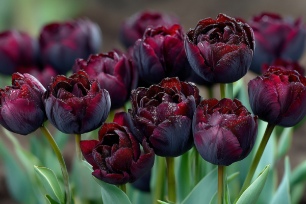 В зависимости от освещения их окрас переливается от глубокого пурпурного до антрацитового, создавая драматичный контраст с яркими красками сада. Эти тюльпаны распустятся уже в конце апреля, достигают высоты 50-70 см и великолепно смотрятся как в монохромных композициях, так и в сочетании с белыми, розовыми или желтыми сортами, подчеркивая их яркость.
