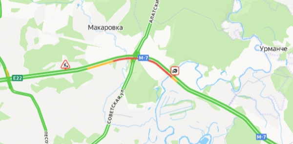На выезде из Авиастроительного района на трассе М7 образовалась 5-километровая пробка. Соответствующая информация следует из сервиса «Яндекс Карты».