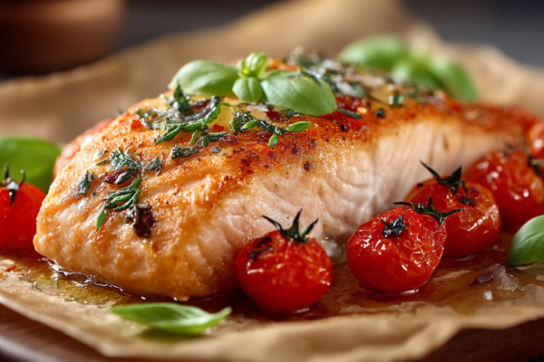 Основа этого блюда — запекание при пониженной температуре с коротким этапом маринования. Именно так рецепт вкусной запеченной рыбы раскрывает вкус горбуши без лишнего жира. Филе выкладывают на пергамент, добавляют помидоры черри, свежий базилик и необычный ингредиент — белый мисо-пасту. Она усиливает вкус рыбы и удерживает влагу, не перебивая натуральный аромат.